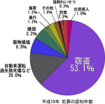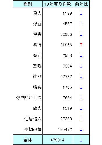 左の表は、平成19年の窃盗を除く一般刑法犯の認知件数と前年との比較を表したものです。