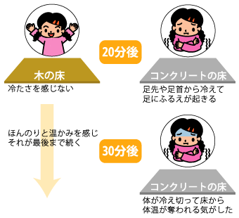 室内の温度は冷暖房で自由に調整できますが、同じ室内でも木の床とコンクリートの床とでは、温度の感じ方が異なります。
