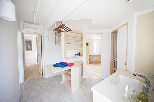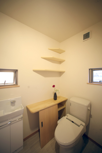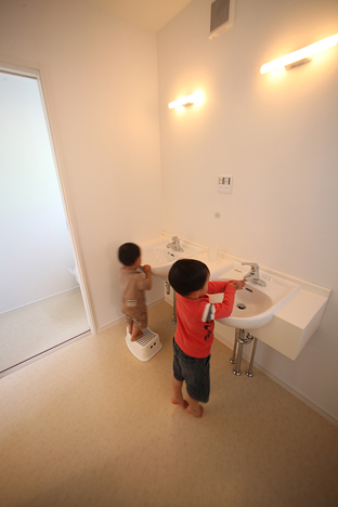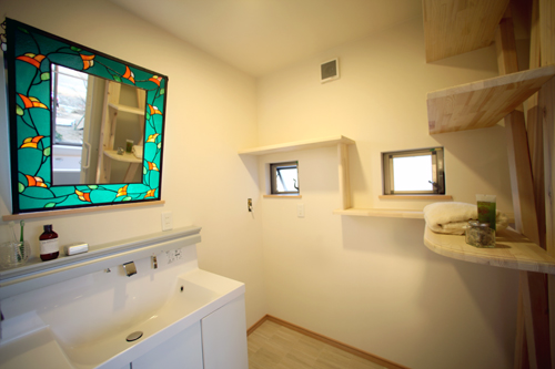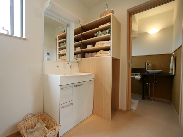 洗面室の機能は、洗面だけでなく、洗濯室、トイレ、脱衣所、家事室などとの併用ができ、自由な空間です。使いやすい洗面室をつくるためには、住み手の生活習慣を基本に考え、何をどこに収納するかを考えると上手くまとまります。