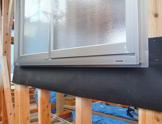 1年中風雨にさらされるバルコニーは構造用合板の上に、不燃板を敷き、その上に防水性の高いFRP(繊維強化プラスチック)を全面に塗布。また、サッシの取り付けに際しては、雨漏りを防ぐために3方向に防水テープを貼り、枠に下には水切りシートを貼付。防水性を高めるため、様々な工夫を施しています。