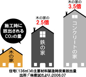 木は自然が育んだ天然素材、生きている材料です。光合成によって二酸化炭素(CO2)を吸収し、酸素を供給してくれます。また、廃棄すると自然分解し、土に還ります。木は再生可能で、持続可能な唯一の素材。さらに耐久性にも優れた理想的な資源です。木の家は、永く大切に住み続けることができる、地球環境に優しい住まいでもあります。
