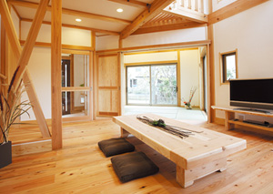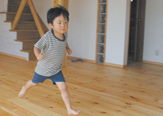 無垢材のフローリングは、足触りがとても良く、夏はひんやり、冬はじわっと暖かいのが特徴です。また使い込む程に本物の木の味わいが楽しめます。
