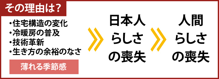 日本人に多大な影響を与えてきた四季。生活環境の都市化や住宅構造の変化、冷暖房の普及、冷凍技術や栽培技術の革新など、「人工環境」が社会から四季を取り上げました。自然からのメッセージを拒否し、四季のめぐりに従って行われてきた数々の文化、行事が継承されなくなれば、日本の文化は消滅してしまいます。日本人らしさが失われていくどころか、情緒のない人間が増加し、人間らしささえ失われていきます。