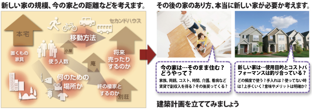 大切なのはイメージや思い。「今の不満」「展望」から、やりたいことをはっきりさせる。今の家と新しい家の兼ね合いや分け方