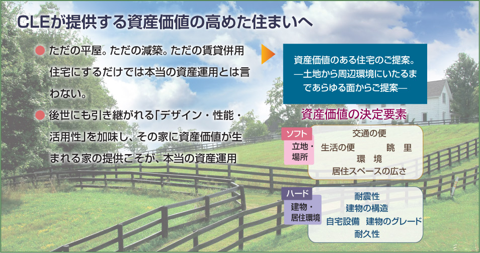 土地の売却や、アパートの建築など、資産を活かして得られた資金でランニングコストの低い新しい案を自己資金0円実現可能。家や老後に豊かさを与えます。