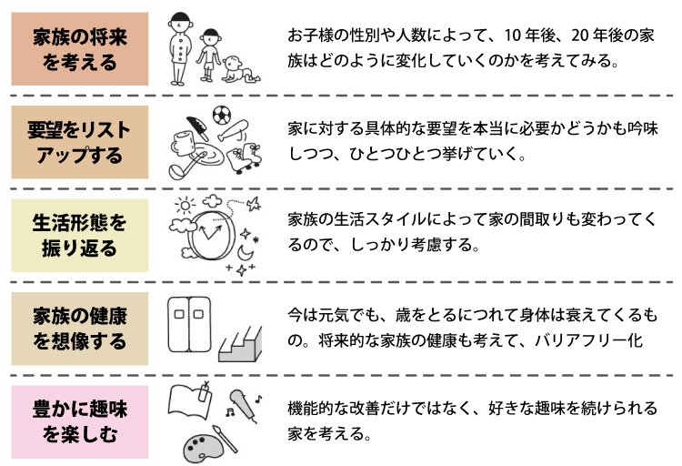機能性に優れ、資産価値が下がりにくいことも大切ですが、それだけでは何十年も永く住める家をつくることはできません。家はそのままでも、住民の家族構成は変わっていきます。住む人の変化に対応できてこそ、永く住み継がれる家といえます。