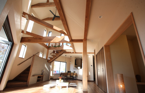 “広がり”とは、各部が、視覚的にも動線的にも繋がりをもつことです。家族が1階と2階に分かれていても、お互いの気配が伝わるように、吹抜けや階段につなぎの役割をもたせたり、吹抜けに面して共用のホールを計画するなど、広がりを立体的に捉えた設計により、限られた敷地でもゆとりのある空間を生み出すことができます。