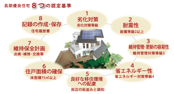 長期優良住宅とは、住まいの骨組みをメンテナンスをすることで長く住み継いでいけるようにつくり、 設備や内装を定期的に更新することでその時代のライフスタイルにあわせた暮らしができるようにする住宅のことです。